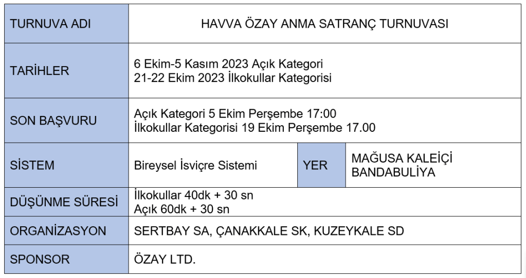 Yaklaşık bir ay boyunca sürecek altı farklı kategoride düzenlenecek turnuvalarda güzel insan merhume Havva Özay’ın anısını yaşatıp aynı zamanda da kendimizi satranç sporunda geliştirme şansını bulacağız. Her yıl olduğu gibi bu yıl da turnuvalarımız Mağusa Kaleiçi Bandabuliya’da gerçekleşecek.