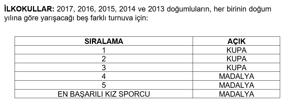 - İlkokullar Kategorileri (21-22 Ekim Cumartesi- Pazar): 2017, 2016, 2015, 2014 ve 2013 doğumlu sporcular için doğum yıllarına göre beş farklı turnuva yapılacaktır. Her sporcu kendi doğum yılı olan turnuvada yarışacaktır.