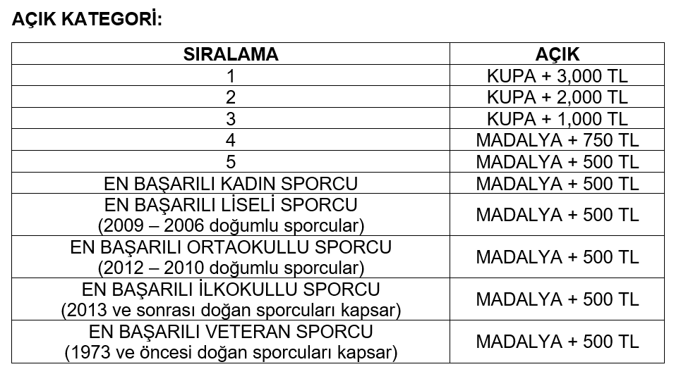 - Ödüller paylaşılmaz. Md. 4.1 deki sıralama dikkate alınır. Sporcu sadece bir ödül alabilir.
