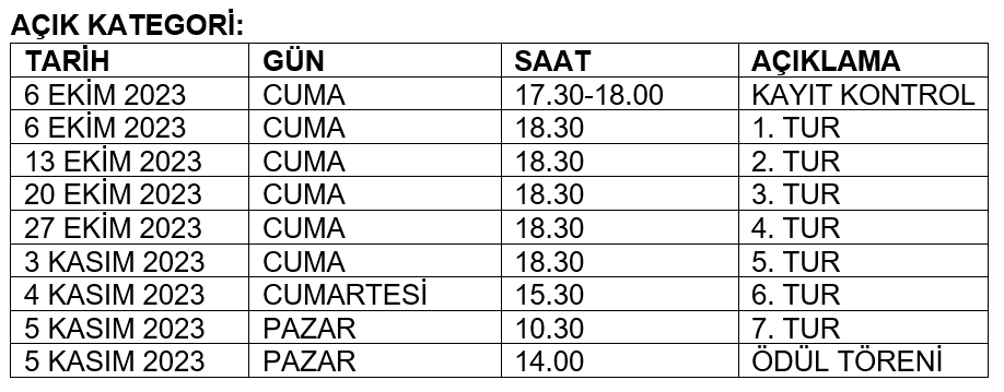 - Açık Kategori (6 Ekim-5 Kasım): Herkese açık, isteyen herkesin katılabileceği turnuvadır.